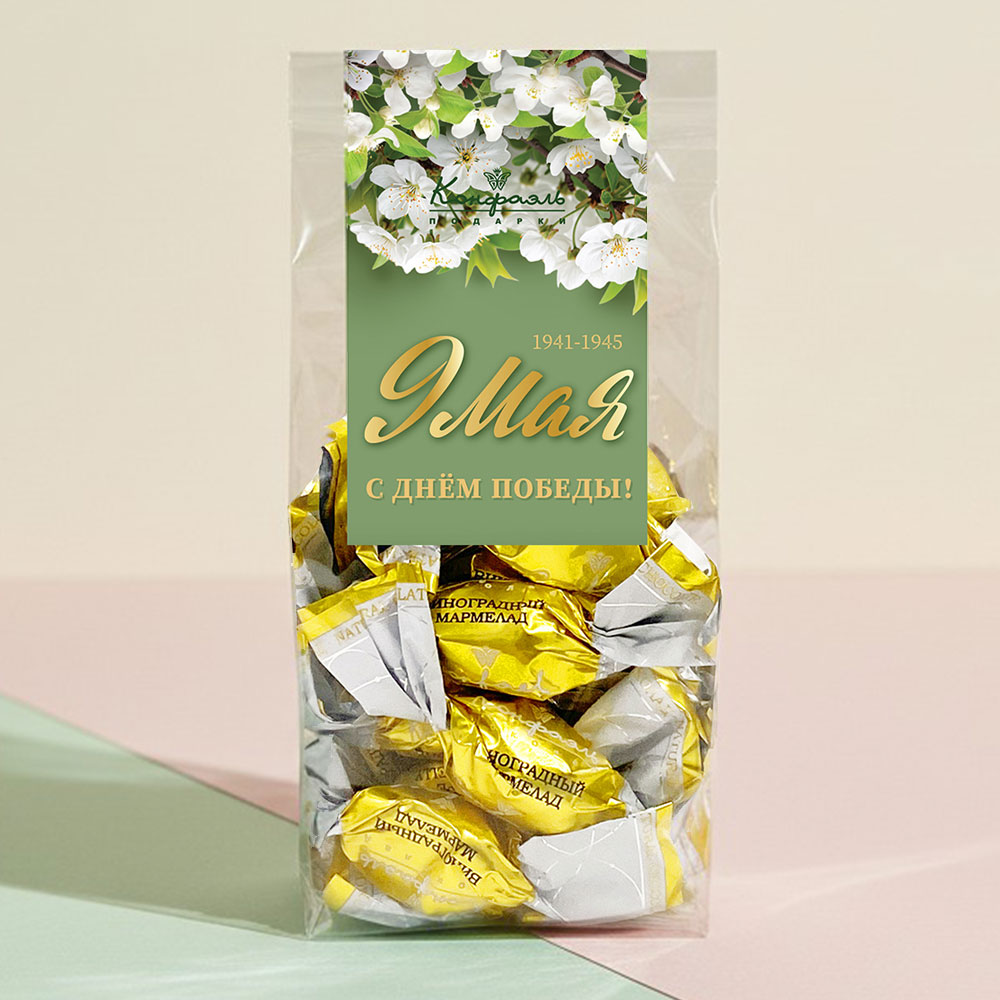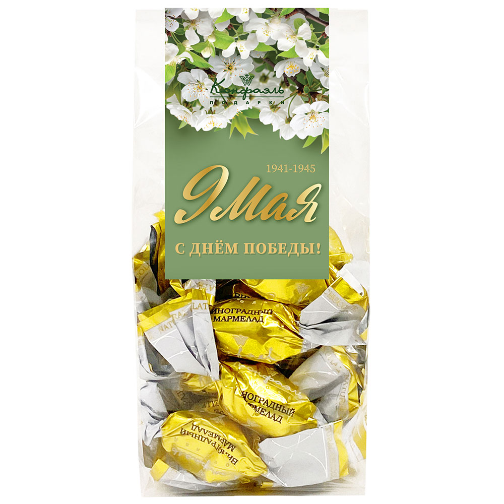 Откройте для себя необычное сочетание традиций и вкуса с мармеладом в горьком шоколаде с виноградной начинкой из специальной серии «9 Мая». Это не просто лакомство — это дань памяти, воплощённая в изысканном десерте.