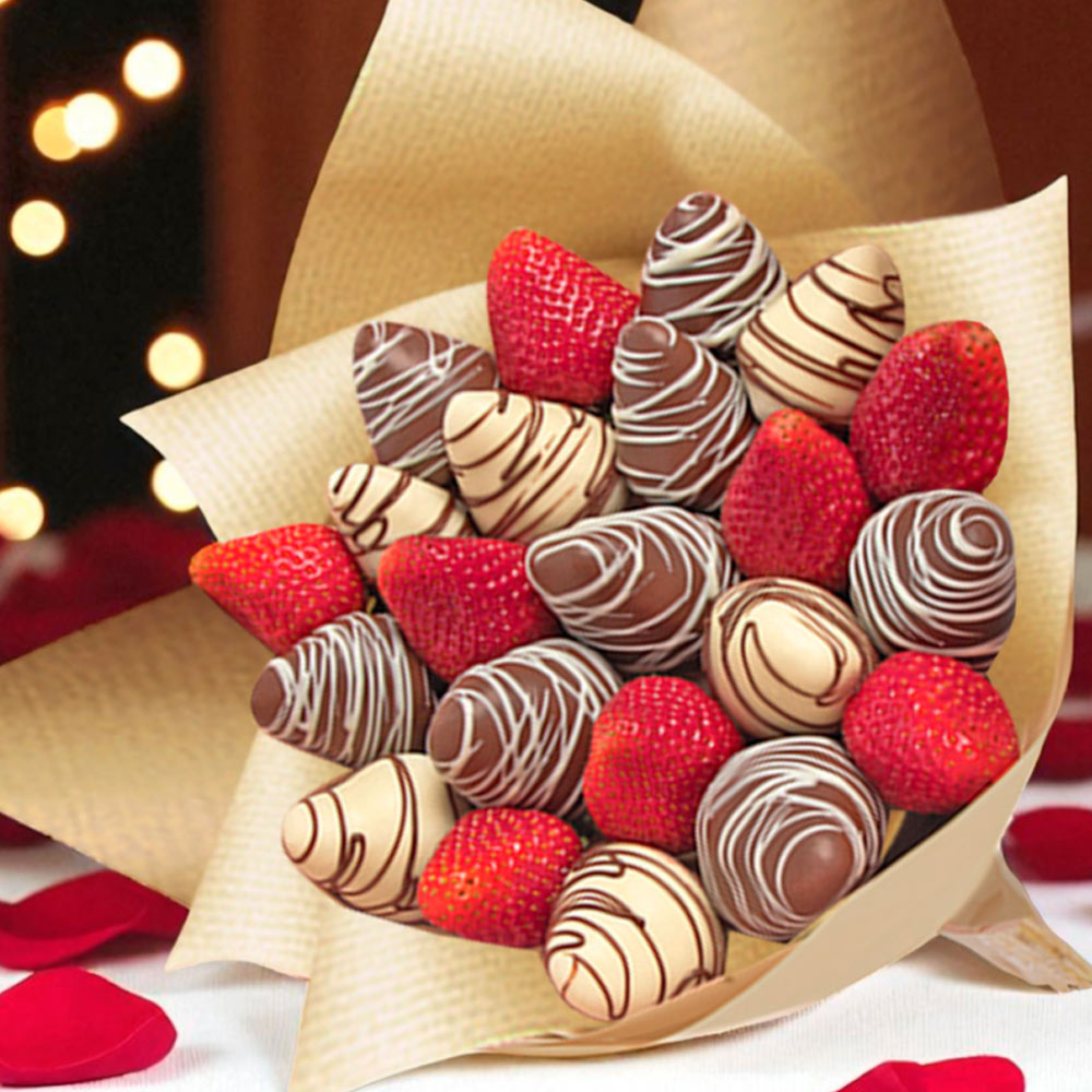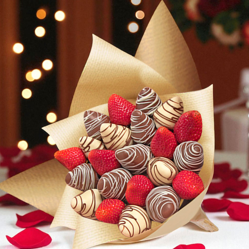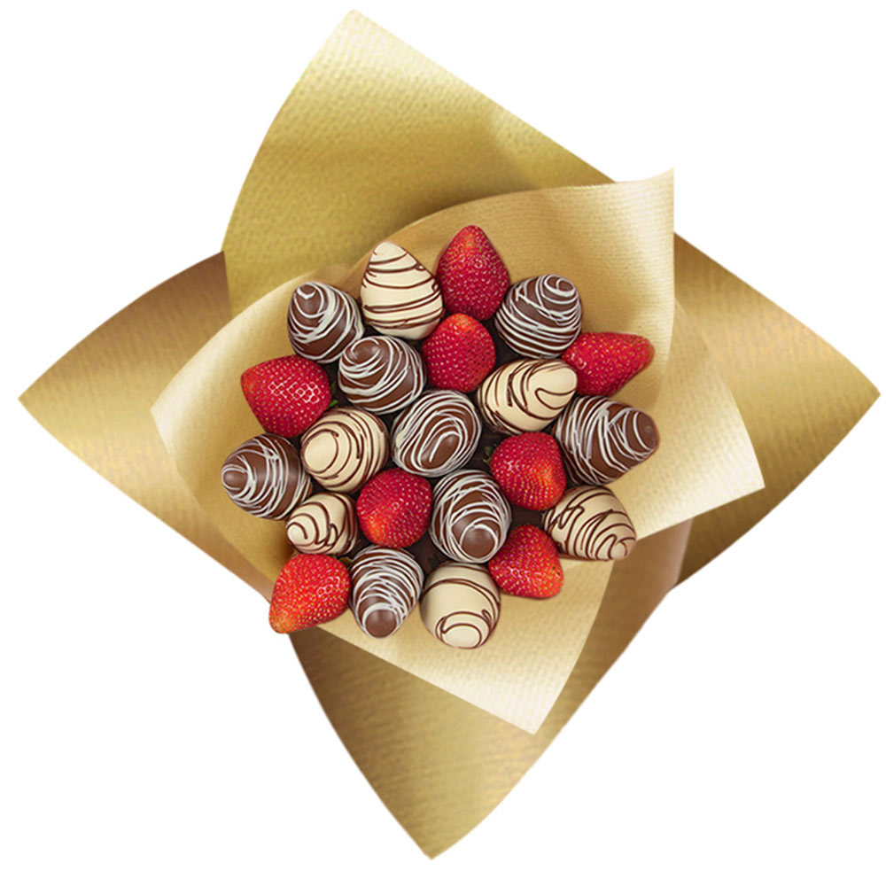 Фото на сайте является примером оформления букетов при среднем размере клубники.