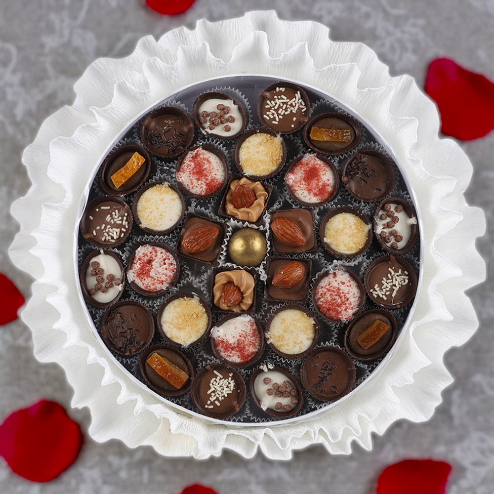 шоколадные массы – какао тертое, сахар, какао-масло, эмульгатор (лецитин соевый), ароматизатор («Ванилин»); начинки – сахар, патока, фруктоза, какао-масло, какао тертое, молоко сгущенное (молоко цельное, сахар (сахароза, лактоза)), молоко сухое цельное, молоко сухое обезжиренное, рафинированные дезодорированные растительные масла, сливочное коровье масло обезвоженное, лактоза, пюре апельсина, пюре яблок, малина, ежевика, черника, брусника, паста из кофе (кофе, растительный жир), какао-крупка, рис воздушный с какао (крупа рисовая, сахар, какао, соль), цукаты апельсиновых корочек, ядра орехов миндаля, ядра орехов фундука, фундук жареный тертый, марципановая масса, стабилизатор (мальтодекстрин), коньяк (дистиллят коньячный, вода, сахар, натуральный пищевой краситель «Карамельный колер»), консервант (сорбиновая кислота), регулятор кислотности (лимонная кислота), эмульгаторы (лецитин соевый, Е471), антиоксидант (экстракт розмарина), загуститель (пектин), ароматизаторы; декор – пищевой краситель (кандурин золотой), глазирователь (капол).