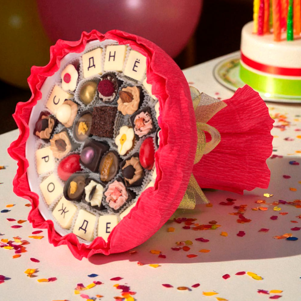 День рождения — будет более праздничным, если именинник получит в этот день такой роскошный подарок: букет сладостей и шоколада «Конфаэль»!