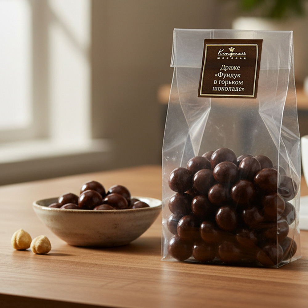 Подарите своим родным пару-тройку небольших прозрачных упаковок с драже «Фундук» в горьком шоколаде - и вкусный десерт поднимет им настроение на весь день!
