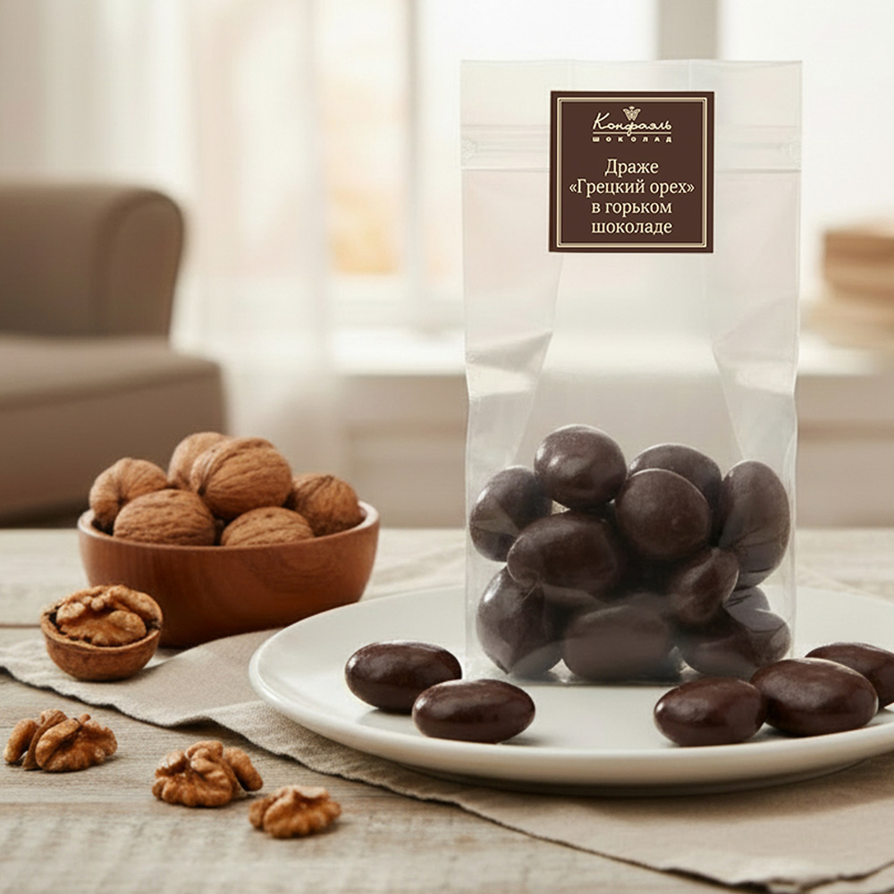 Прозрачная упаковка, не скрывающая своё соблазнительное содержимое - драже «Грецкий орех» в горьком шоколаде, - желанный подарок для ваших близких.