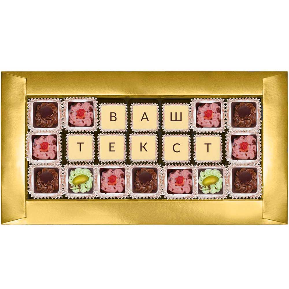 Текст выкладывается съедобной шоколадной мозаикой, которую с удовольствием съест получатель.
