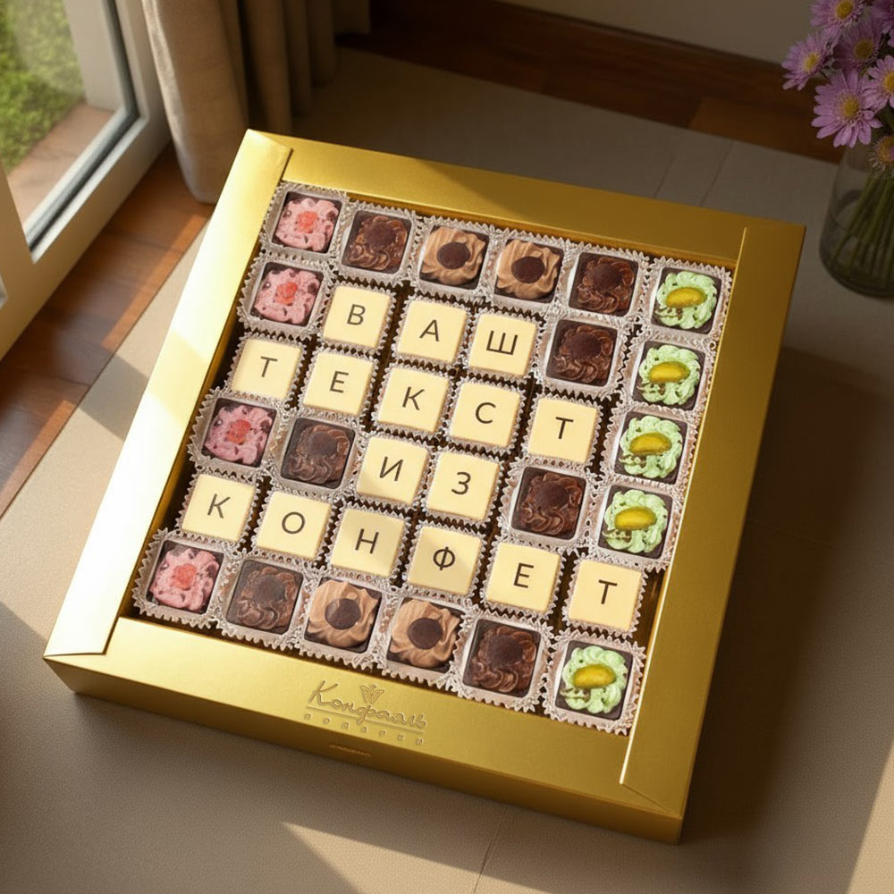 Из ассортимента более 100 шоколадных конфет с изысканными начинками, вы можете собрать индивидуальное шоколадное поздравление на любой праздник.