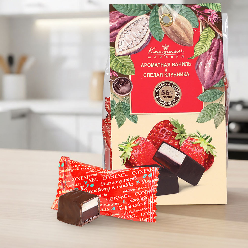 шоколадная масса - какао тертое, сахар, какао-масло, эмульгатор (лецитин соевый), ароматизатор ("Ванилин"), начинки - сахар, патока, молоко сгущенное (молоко цельное, сахар (сахароза, лактоза)), масло сладко-сливочное, натуральный концентрированный клубничный сок, яичный белок сухой, желирующие агенты (агар, желатин говяжий), консервант (сорбиновая кислота), регулятор кислотности (лимонная кислота), эмульгатор (Е471), ароматизаторы, натуральный экстракт ванили.