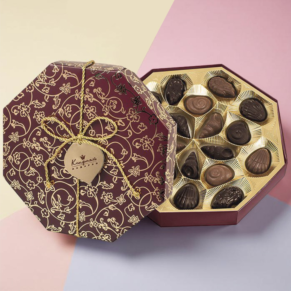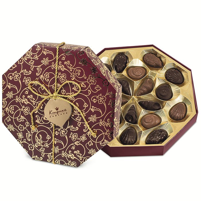 шоколадные массы – какао-масло, какао тертое, сахар, эмульгатор (лецитин соевый), ароматизатор («Ванилин»); начинки – сахар, патока, какао-масло, какао тертое, молоко сгущенное (молоко цельное, сахар (сахароза, лактоза)), рафинированные, дезодорированные, растительные масла, стабилизатор (мальтодекстрин), коньяк (дистиллят коньячный, вода, сахар, натуральный пищевой краситель «карамельный колер»), спирт этиловый ректификованный, консервант (сорбиновая кислота), эмульгаторы (лецитин соевый, Е471), регулятор кислотности (лимонная кислота), сливки сгущенные с сахаром (сливки нормализованные, сахар (сахароза), лактоза) ароматизаторы («Апельсин», «Кофе», «Мокка»).