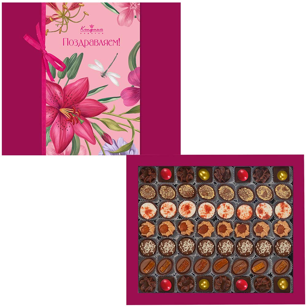 Состав: шоколад – сахар, какао тёртое, масло какао, сыворотка молочная сухая, сухое цельное молоко, эмульгатор (лецитин соевый), ароматизаторы; начинки – сахар, патока, какао-масло, какао тертое, молоко сгущенное (молоко цельное, сахар (сахароза, лактоза)), жир специального назначения (масло ши, рапсовое масло, соевое масло, антиокислитель (лимонная кислота)), молоко сухое цельное, молоко сухое обезжиренное, белый шоколад (сахар, молоко сухое цельное, масло какао, эмульгатор (лецитин соевый), ароматизатор, соль), масла растительные рафинированные дезодорированные (подсолнечное, рапсовое, оливковое; масло сладко-сливочное, молоко сухое обезжиренное), малина, ежевика, черника, брусника, пюре яблок, малина сублимированная, кранч «Апельсин», паста из кофе (кофе, растительный жир), цукаты апельсиновых корочек, ананас сушеный, клюква сушеная, ядра орехов миндаля, фундук жареный тертый, марципановая масса, соль, какао-порошок, стабилизаторы (мальтодекстрин), коньяк (дистиллят коньячный, вода, сахар, пищевой краситель (сахарный колер)), спирт этиловый ректификованный, консервант (сорбиновая кислота), антиоксидант (экстракт розмарина), загуститель (пектин), регулятор кислотности (лимонная кислота), эмульгаторы (лецитин соевый, Е471), ароматизаторы; декор – пищевые красители (кандурин золотой, кандурин красный янтарь), глазирователь (капол). Внимание! Продукция производится на предприятии, где используются арахис, кунжут, орехи, яичные и молочные продукты, злаки, содержащие глютен.