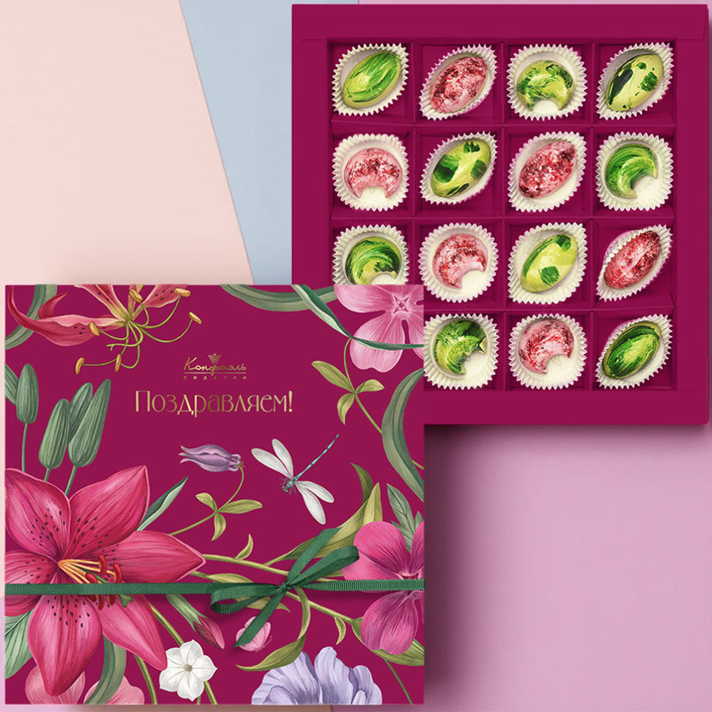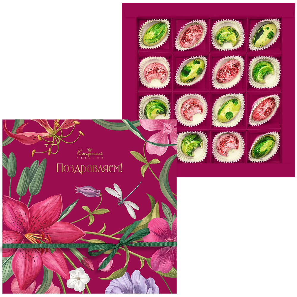 Состав: шоколад - сахар, какао тёртое, масло какао, эмульгатор (лецитин соевый), ароматизатор; начинки - сахар, какао-масло, какао-порошок, какао тертое, молоко сгущенное (молоко цельное, сахар (сахароза, лактоза)), молоко сухое цельное, эмульгатор (лецитин соевый), натуральный концентрированный сок клубники, орех фисташки дробленый, вода, сахар, пищевой краситель (сахарный колер)), консервант (сорбиновая кислота), эмульгаторы (лецитин соевый, Е471), соль, чай Матча, ароматизаторы, пищевые красители (красный свекольный, куркумин, медные комплексы хлорофиллов и хлорофиллинов); декор - пищевые красители (Е171).