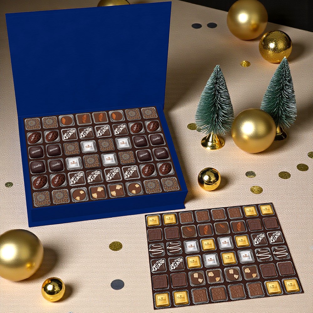 Наслаждайтесь неповторимым сливочным шоколадом с миндалем, фундуком, ассорти начинками, желе апельсиновыми, грильяжем, ананасовым суфле, марципаном и сухофруктами в горьком шоколаде - всего в одном уникальном собрании!