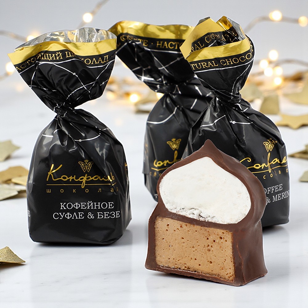 Состав: шоколадные массы – сахар, тертое какао, масло какао, какао-порошок, эмульгатор (лецитин соевый), натуральная ваниль; начинки – сахар, патока, молоко сгущенное (молоко цельное, сахар (сахароза, лактоза)), масло сладко-сливочное, белок яичный порошкообразный, какао-порошок, желирующие агенты (агар), консервант (сорбиновая кислота), регулятор кислотности (лимонная кислота), ароматизаторы. Продукция производится на предприятии, где используются арахис, кунжут, орехи, яичные и молочные продукты, злаки, содержащие глютен.