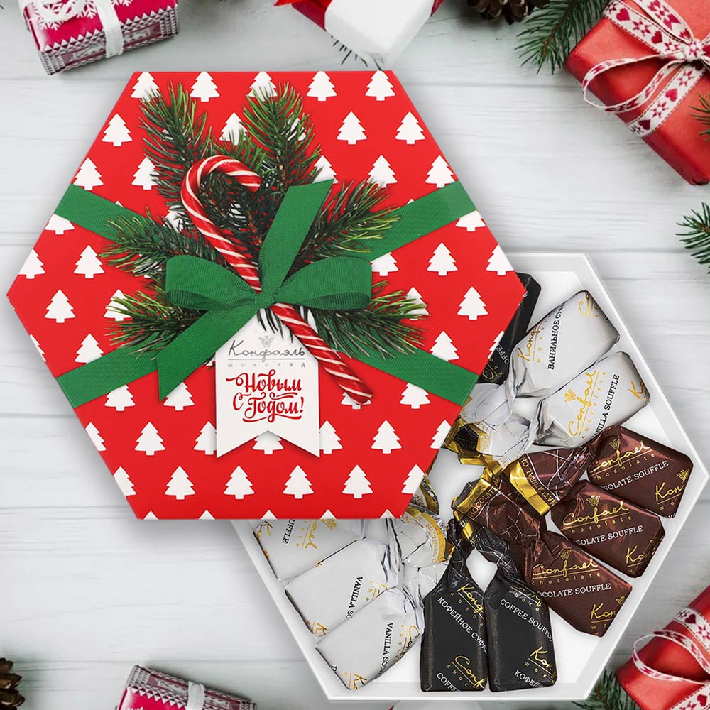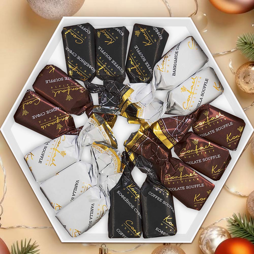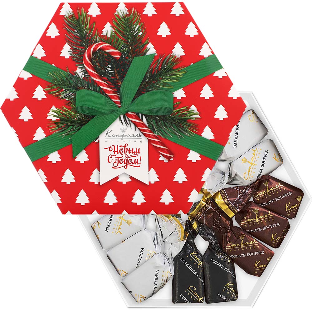 Новогодний набор конфет "Суфле" (ванильное, шоколадное, кофейное) в шоколаде 105г (красный)