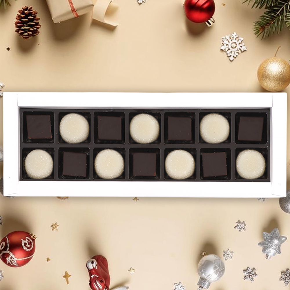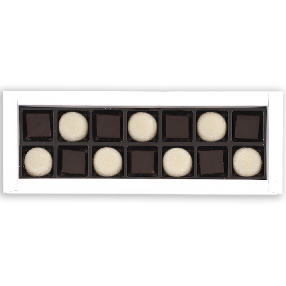 Состав: шоколадная масса -сахар, какао тертое, масло какао, какао-порошок, эмульгаторы (соевый лецитин, Е476); начинки - сахар, патока, молоко сгущенное (молоко цельное, сахар (сахароза, лактоза)), масло сладко-сливочное, белок яичный, желирующий агент (агар), желатин говяжий, регулятор кислотности (кислота лимонная), консервант (сорбиновая кислота), эмульгатор (Е471), экстракт ванили, ароматизаторы, пищевой краситель (Е171).