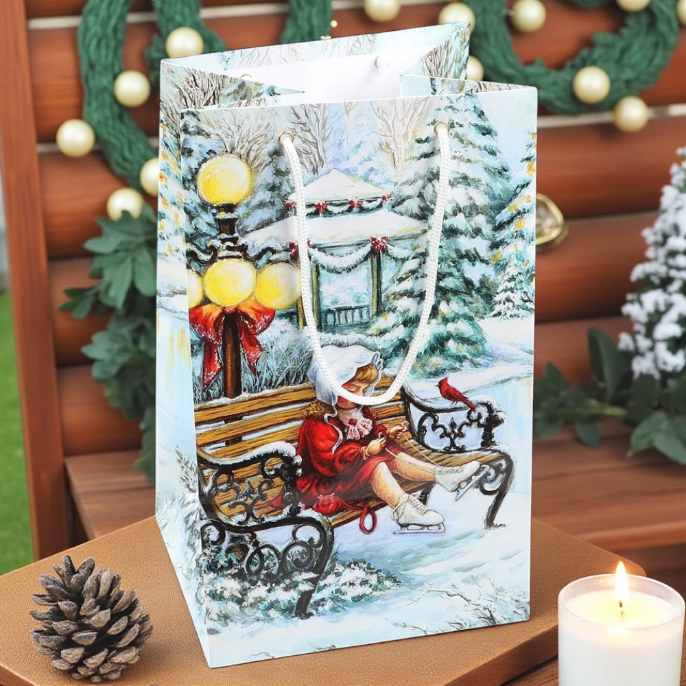 Представляем уникальный новогодний подарочный пакет средней величины с очаровательным дизайном «Девочка на коньках». Этот волшебный аксессуар подарит вашим близким яркие эмоции и праздничное настроение!