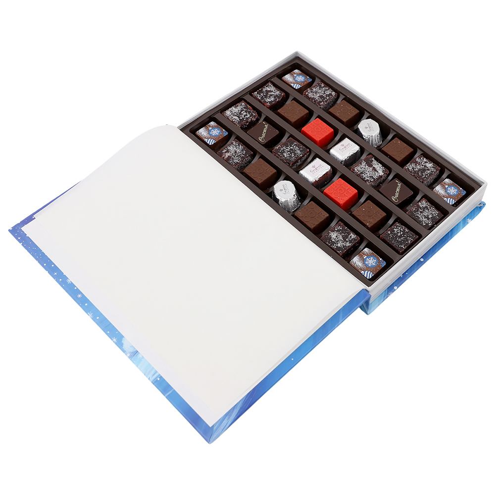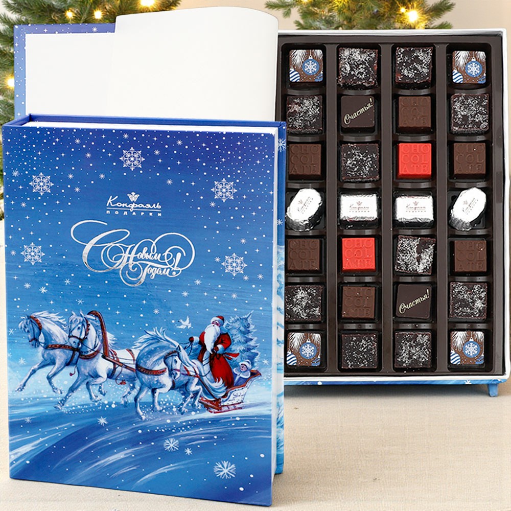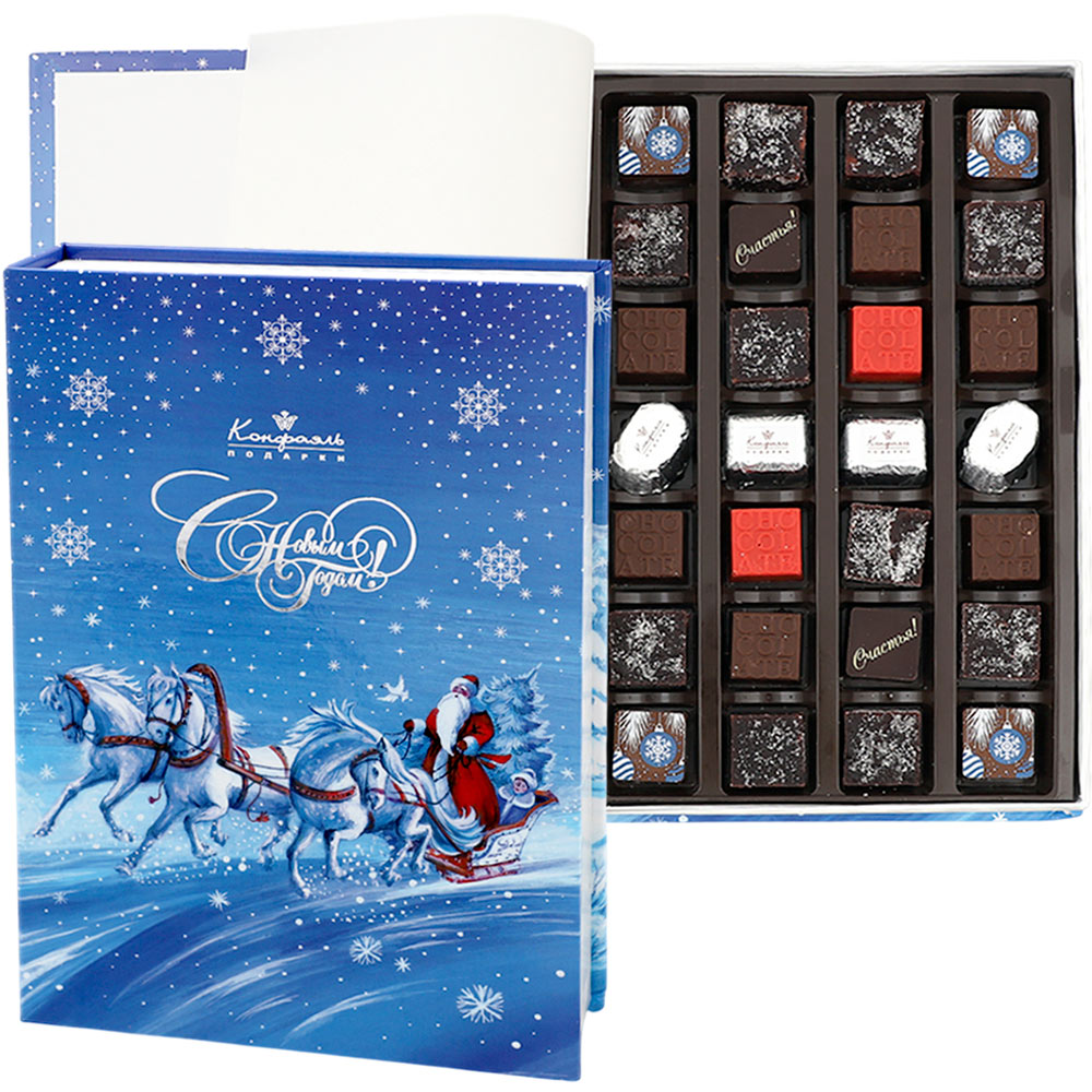 Состав: шоколадные массы - сахар, масло какао, молоко цельное сухое, сухое обезжиренное молоко, какао тертое, какао-порошок, сыворотка молочная сухая, пахта сухая, молочный жир, паста ореховая из ядер фундука, эмульгаторы (соевый лецитин, Е476), соль, натуральная ваниль, ароматизаторы; начинки - сахар, патока, какао-масло, какао тертое, молоко сгущенное (молоко цельное, сахар (сахароза, лактоза)), масла растительные рафинированные дезодорированные (подсолнечное, рапсовое, оливковое; масло сладко-сливочное, молоко сухое обезжиренное), сливая свежая, жир специального назначения (масло ши, рапсовое масло, соевое масло, антиокислитель (лимонная кислота)), молоко сухое цельное, молоко сухое обезжиренное, белый шоколад (сахар, масло какао, сухое обезжиренное молоко, сухое цельное молоко, эмульгатор (лецитин соевый), экстракт ванили), стабилизатор (мальтодекстрин), желирующий агент (пектины), коньяк (дистиллят коньячный, вода, сахар, пищевой краситель (сахарный колер)), консервант (сорбиновая кислота), регулятор кислотности (лимонная кислота), эмульгаторы (лецитин соевый, Е471), ароматизаторы, пищевой краситель (сахарный колер); декор - пищевые красители (Е132, Е171, Е172)