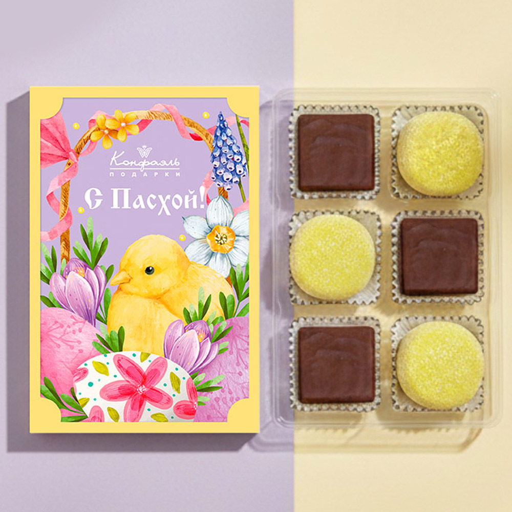 Состав: шоколадные массы – сахар, тертое какао, какао-порошок, масло какао, эмульгаторы (лецитин соевый, Е476), ароматизаторы; начинки – сахар, патока, молоко сгущенное (молоко цельное, сахар (сахароза, лактоза)), масло сладко-сливочное, белок яичный, желирующий агент (агар), желатин говяжий, консервант (сорбиновая кислота), регулятор кислотности (лимонная кислота), ароматизаторы, пищевой краситель «Куркумин». Внимание! Продукция производится на предприятии, где используются арахис, кунжут, орехи, яичные и молочные продукты, злаки, содержащие глютен.