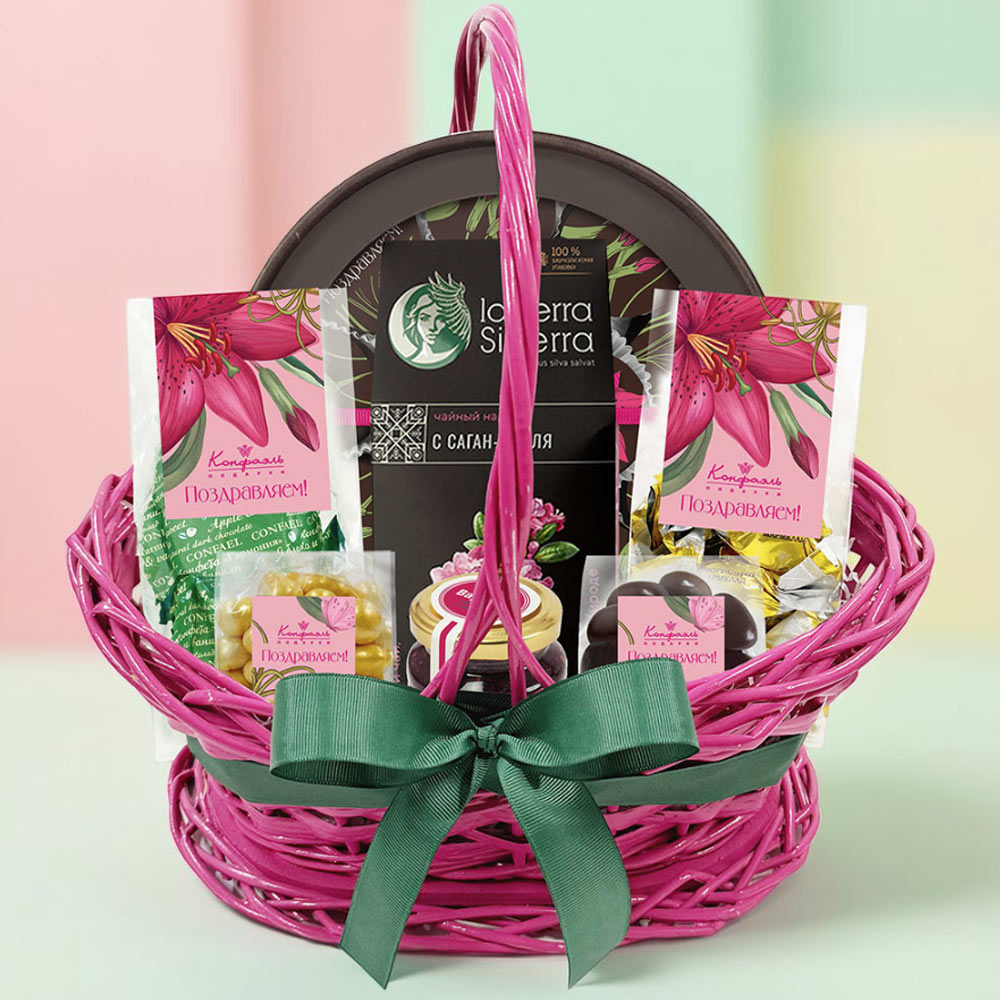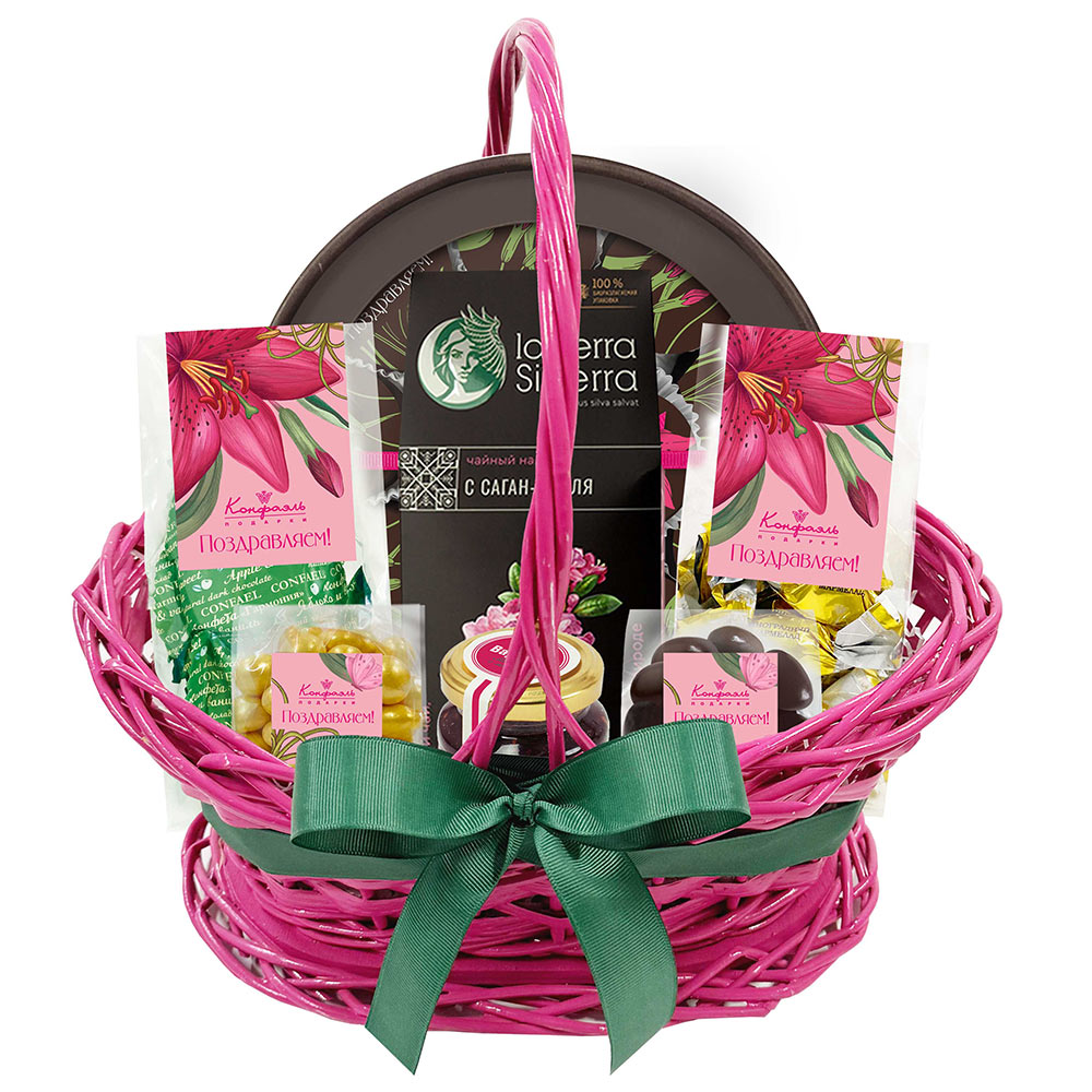 Подарочная корзина: драже, конфеты глазированные, варенье, чай