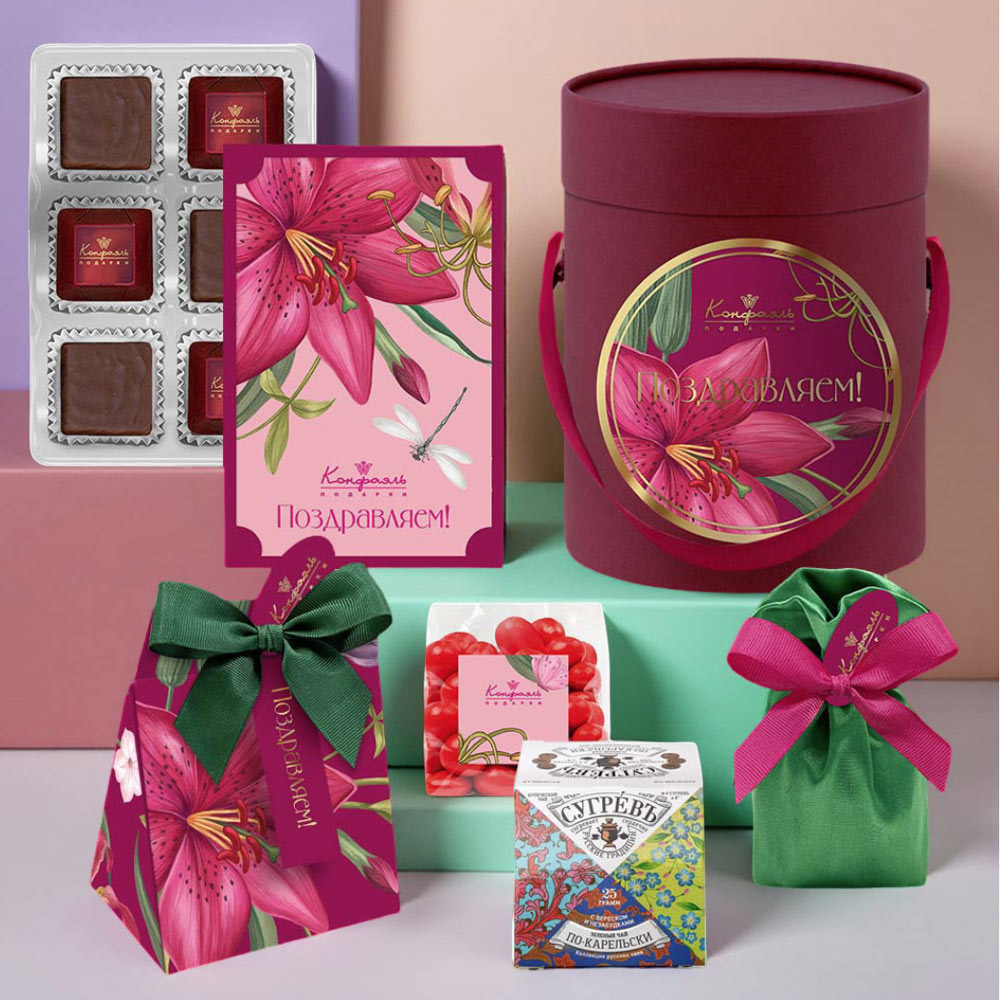 Поздравление 06/ Шоколадные конфеты «Ассорти» со сливочными начинками, конфеты «Суфле» в горьком шоколаде со вкусом «Игристого розе»/ 45г