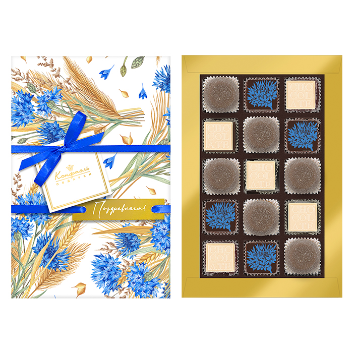 Состав: шоколадные массы - сахар, тертое какао, какао-порошок, масло какао, молоко сухое цельное, эмульгатор (лецитин соевый); начинки - сахар, патока, молоко сгущенное (молоко цельное, сахар (сахароза, лактоза)), сливки сгущенные с сахаром (сливки нормализованные, сахар (сахароза), лактоза), масла растительные рафинированные дезодорированные (подсолнечное, рапсовое, оливковое; масло сливочное (из пастеризованных коровьих сливок), молоко сухое обезжиренное), стабилизатор (мальтодекстрин), желирующие агенты (агар, желатин говяжий), коньяк (дистиллят коньячный, вода, сахар, пищевой краситель «Карамельный колер»), консервант (сорбиновая кислота), регулятор кислотности (лимонная кислота), эмульгаторы (лецитин соевый, Е471), ароматизаторы, пищевой краситель «Карамельный колер»; декор - пищевые красители (Е132, Е171). Продукция производится на предприятии, где используются арахис, кунжут, орехи, яичные и молочные продукты, злаки, содержащие глютен.