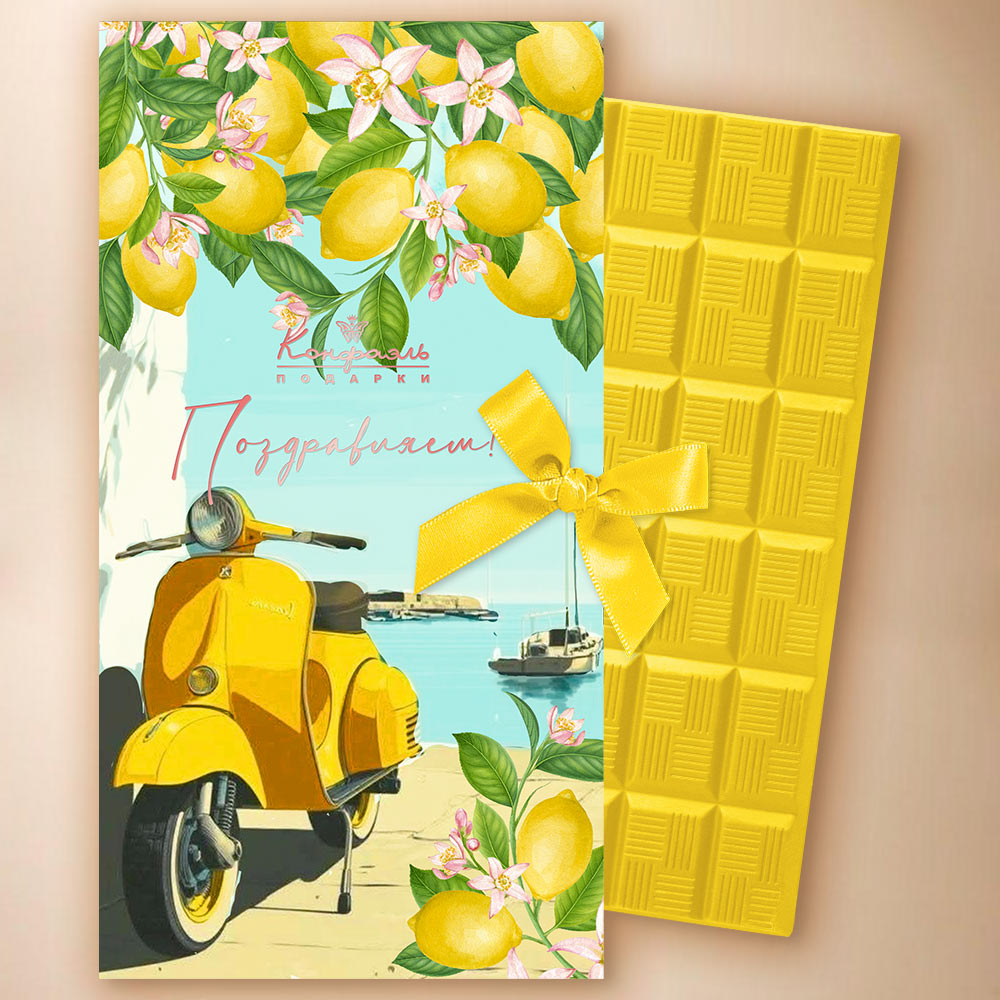 Состав: шоколад - сахар, молоко сухое цельное, масло какао, эмульгатор (лецитин соевый), соль, экстракт лимона ароматизаторы, пищевой краситель куркумин.