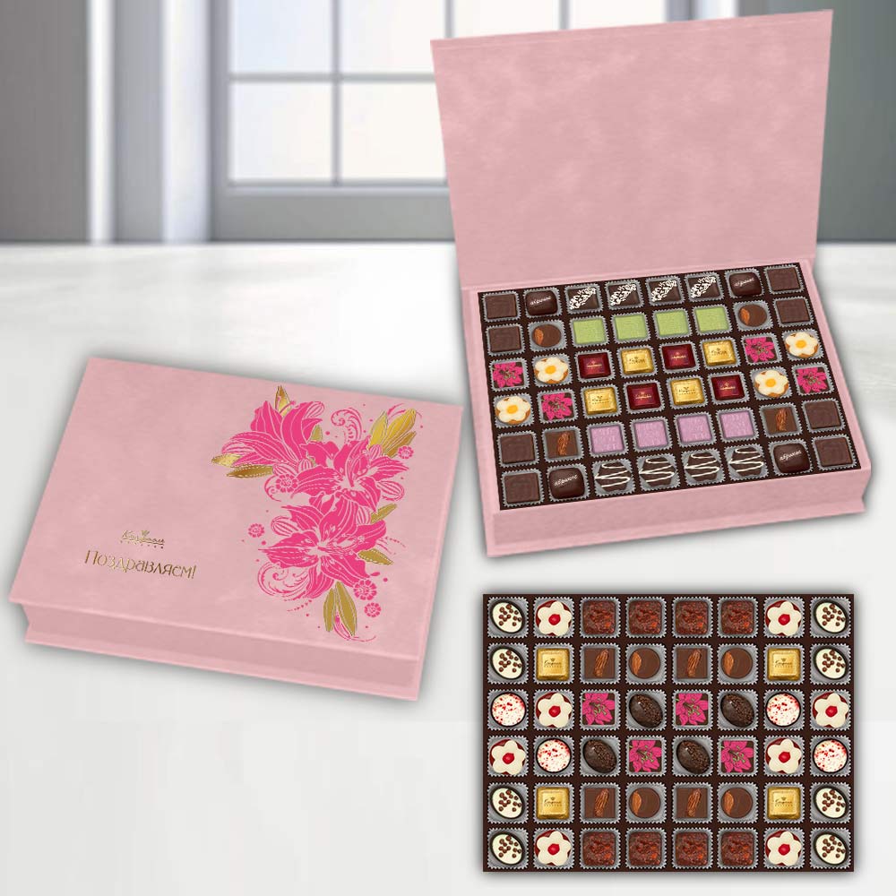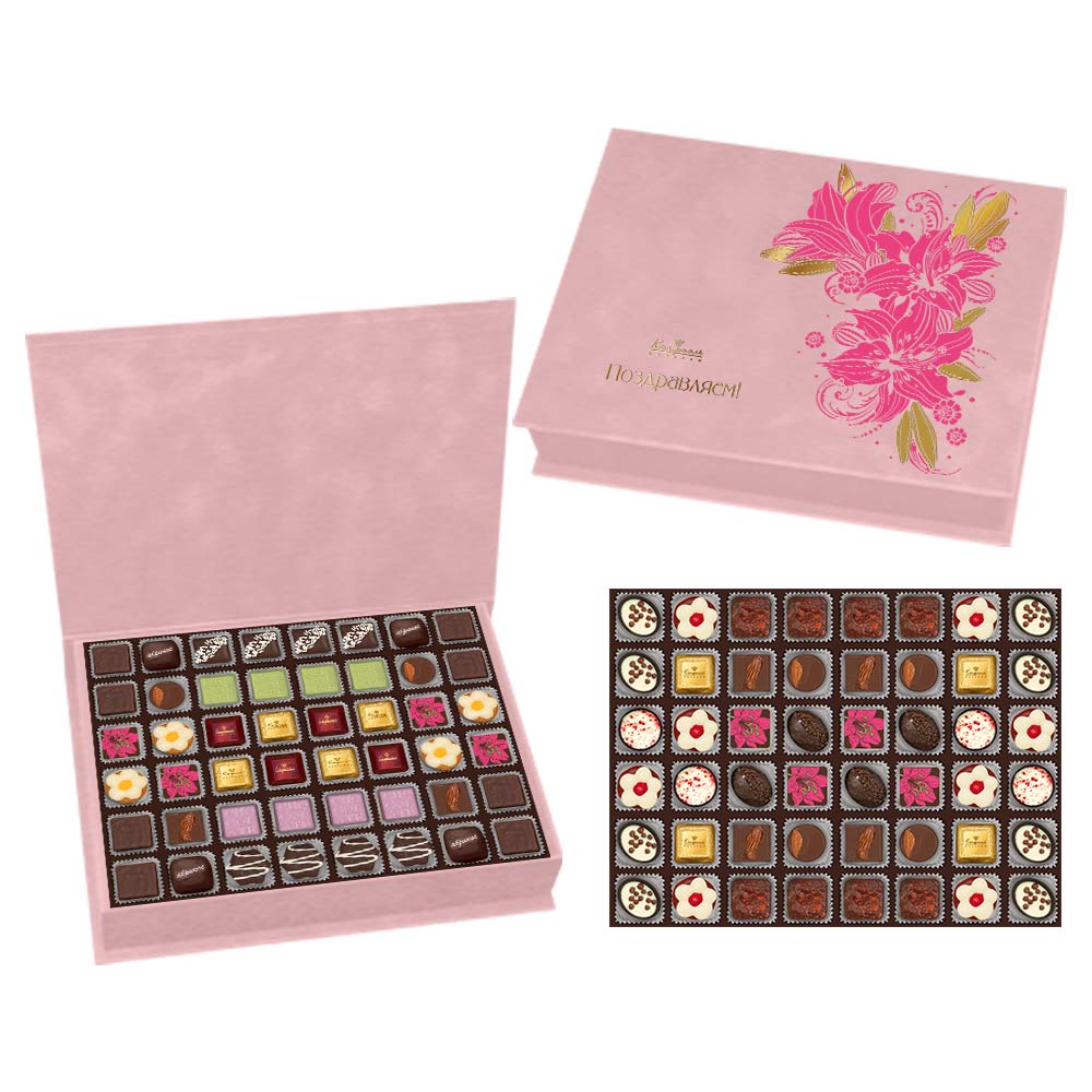 Состав: шоколад- сахар, масло какао, сыворотка молочная сухая, сухое цельное молоко, какао тёртое, эмульгатор (лецитин соевый), ароматизаторы, соль; начинки - сахар, патока, какао-масло, какао тертое, молоко сгущенное (молоко цельное, сахар (сахароза, лактоза)), масла растительные рафинированные дезодорированные (подсолнечное, рапсовое, оливковое; масло сладко-сливочное, молоко сухое обезжиренное), жир специального назначения (масло ши, рапсовое масло, соевое масло, антиокислитель( лимонная кислота)), молоко сухое цельное, молоко сухое обезжиренное, белый шоколад (сахар, молоко сухое цельное, масло какао, эмульгатор (лецитин соевый), ароматизатор, соль), масло сладко - сливочное, белок яичный порошкообразный, натуральные концентрированные соки (апельсин, вишня), клубника сушеная, кумкват сушеный, пюре манго, пюре маракуйи, малина, ежевика, черника, брусника, пюре яблок, малина сублимированная, рис воздушный с какао (крупа рисовая, сахар, какао, соль), цукаты лимонных корочек, папайя сушеная, ананас сушеный, финики, слива свежая, абрикос свежий, ядра орехов фундука, ядра орехов миндаля, марципановая масса, какао-порошок, стабилизаторы (мальтодекстрин), желирующий агент (агар), желатин говяжий, коньяк (дистиллят коньячный, вода, сахар, пищевой краситель (сахарный колер)), спирт этиловый ректификованный, консервант (сорбиновая кислота), регулятор кислотности (лимонная кислота), антиокидант (экстракт розмарина), загуститель (пектин), эмульгаторы (лецитин соевый, Е471), чай Матча, экстракт лаванды, ароматизаторы, пищевые красители (сахарный колер, сухой сок черники, красный свекольный, куркумин); декор - пищевые красители (Е171, красный свекольный, медные комплексы хлорофиллов и хлорофиллинов, кандурин красный янтарь). Внимание! В продукте возможно наличие фрагментов фруктовых косточек (кураги натуральной, фиников натуральных, чернослива натурального). Продукция производится на предприятии, где используются арахис, кунжут, орехи, яичные и молочные продукты, злаки, содержащие глютен