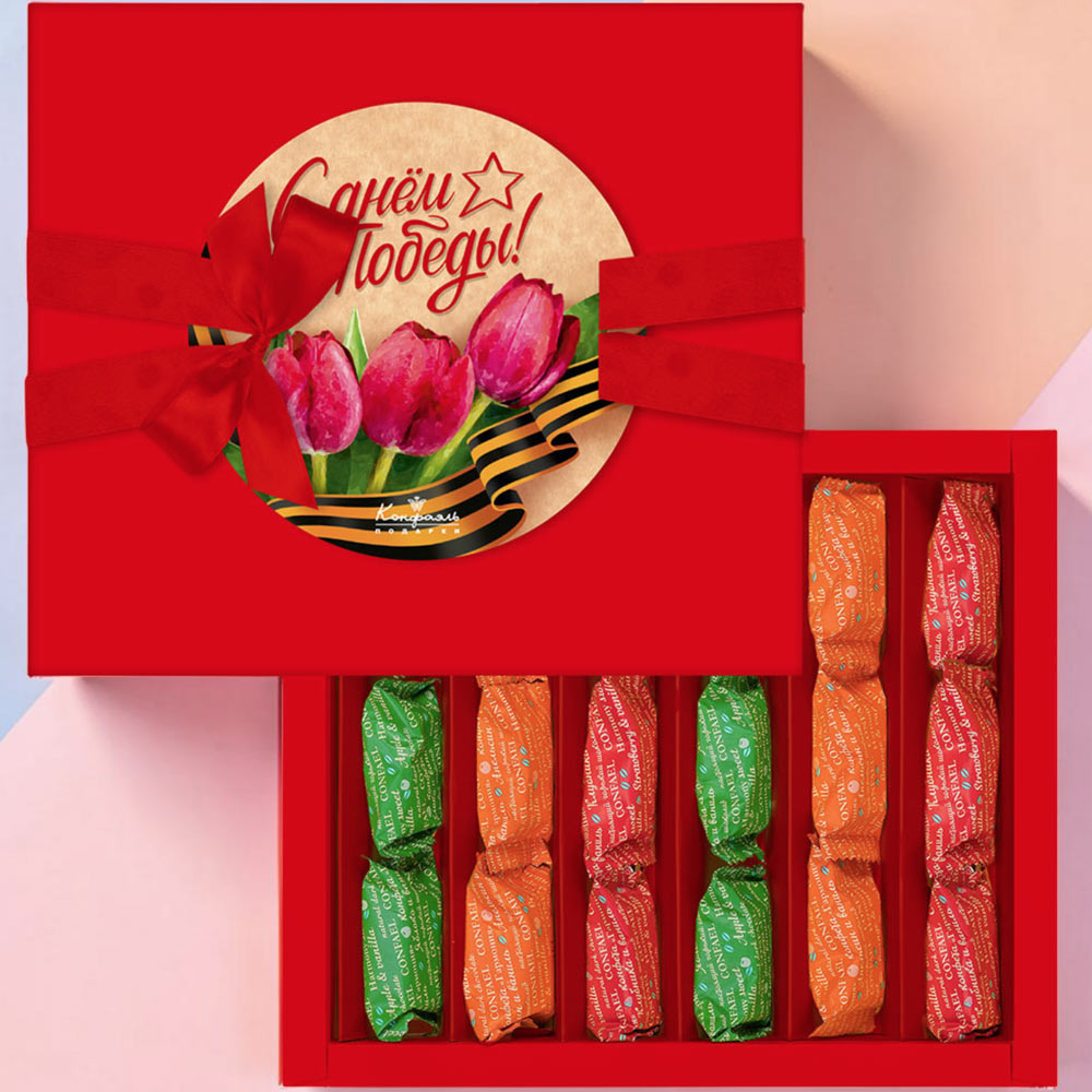 Состав: шоколадная масса – какао тертое, сахар, какао-масло, эмульгатор (лецитин соевый), ароматизатор («Ванилин»), начинки – сахар, патока, молоко сгущенное (молоко цельное, сахар ( сахароза, лактоза)), масло сладко-сливочное, яичный белок, натуральные концентрированные соки (клубничный, апельсиновый, яблочный), желирующие агенты (агар, желатин говяжий), консервант (сорбиновая кислота), регулятор кислотности (лимонная кислота), эмульгатор (Е471), ароматизаторы, натуральный экстракт ванили. Продукция производится на предприятии, где используются арахис, кунжут, орехи, яичные и молочные продукты, злаки, содержащие глютен.