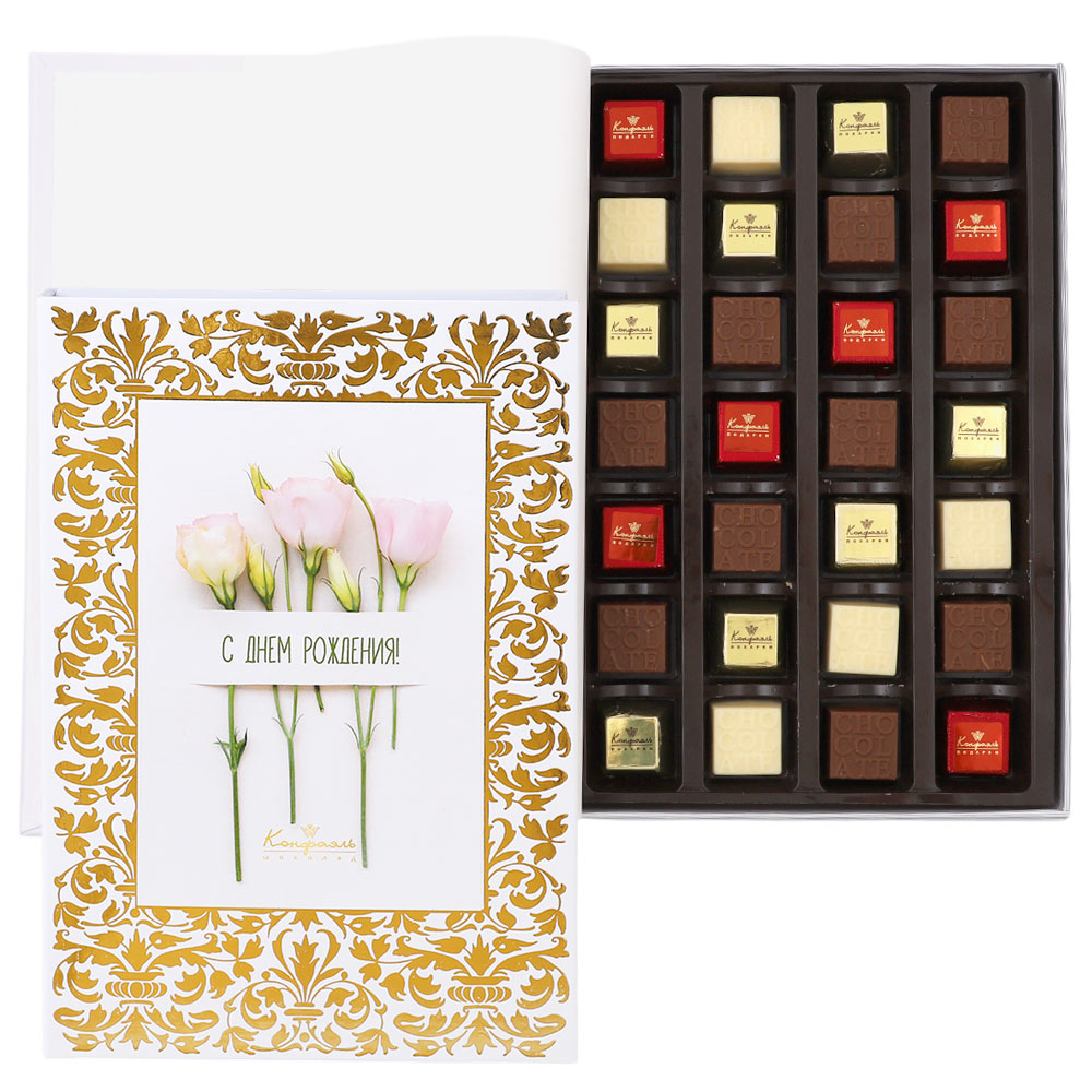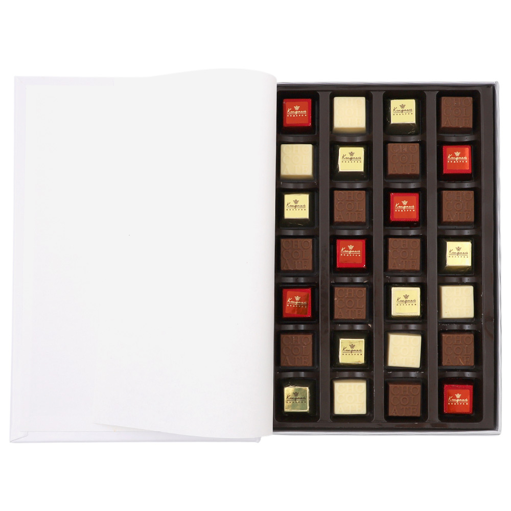 Cостав: шоколадные массы – сахар, масло какао, молоко цельное сухое, сухое обезжиренное молоко, какао тертое, какао-порошок, сыворотка молочная сухая, пахта сухая, молочный жир, паста ореховая из ядер фундука, эмульгаторы (соевый лецитин, Е476), соль, натуральная ваниль, ароматизаторы; начинки – сахар, патока, какао-масло, какао тертое, молоко сгущенное (молоко цельное, сахар (сахароза, лактоза)), жир специального назначения (масло ши, рапсовое масло, соевое масло, антиокислитель (лимонная кислота)), молоко сухое цельное, молоко сухое обезжиренное, белый шоколад (сахар, масло какао, сухое обезжиренное молоко, сухое цельное молоко, эмульгатор (лецитин соевый), экстракт ванили), масла растительные рафинированные дезодорированные (подсолнечное, рапсовое, оливковое; масло сладко-сливочное, молоко сухое обезжиренное), стабилизатор (мальтодекстрин), коньяк (дистиллят коньячный, вода, сахар, пищевой краситель (сахарный колер)), консервант (сорбиновая кислота), регулятор кислотности (лимонная кислота), эмульгаторы (лецитин соевый, Е471), ароматизаторы, пищевые красители (сахарный колер)