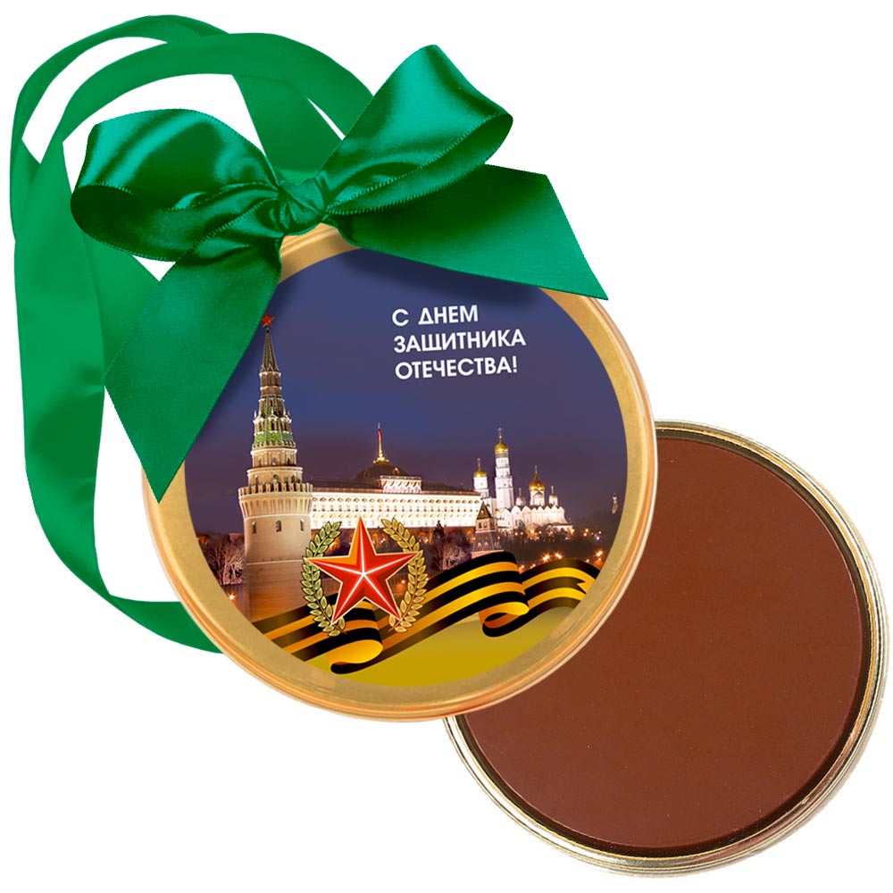 Медаль «С Днём Защитника Отечества!» из молочного шоколада - красивая и вкусная награда-аванс подрастающим воинам. Пусть дети узнают ещё в детстве, как сладок вкус победы!
