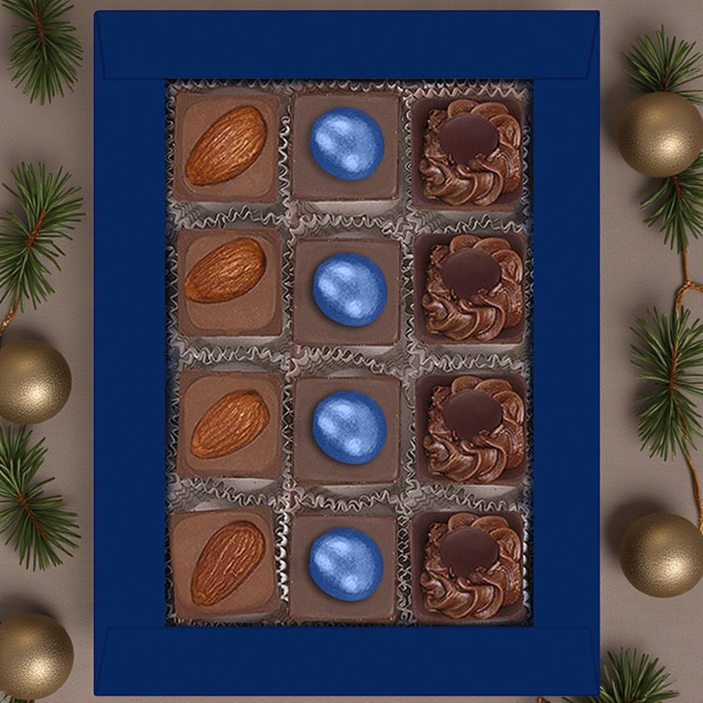 Состав: шоколадная масса – сахар, тертое какао, масло какао, какао-порошок, сыворотка молочная сухая, тертое какао, пахта сухая, эмульгатор (лецитин соевый), натуральная ваниль; начинки – сахар, патока, какао-масло, какао тертое, молоко сгущенное (молоко цельное, сахар (сахароза, лактоза)), молоко сухое цельное, молоко сухое обезжиренное, ананас сушеный, ядра орехов миндаля, фундук жареный тертый, марципановая масса, коньяк (дистиллят коньячный, вода, сахар, натуральный пищевой краситель («сахарный колер»), спирт этиловый ректификованный, регулятор кислотности (лимонная кислота), эмульгаторы (лецитин соевый, Е471), ароматизаторы; декор – пищевой краситель кандурин синий, глазирователь (капол).