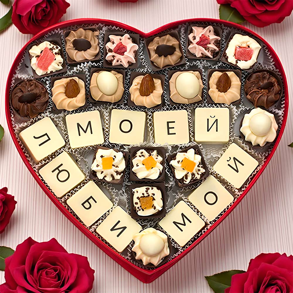 шоколадные массы – какао-масло, какао-тертое, сахар, молоко сухое цельное, молоко сухое обезжиренное, лактоза, эмульгатор (лецитин соевый), ароматизатор («Ванилин»); начинки – сахар, патока, фруктоза, какао-масло, какао тертое, молоко сгущенное (молоко цельное, сахар (сахароза, лактоза)), молоко сухое цельное, молоко сухое обезжиренное, рафинированные дезодорированные растительные масла, масло сладко-сливочное, натуральные концентрированные соки, клубника сублимированная,цукаты апельсиновых корочек, папайя сушеная, ядра орехов фундука, ядра орехов миндаля, фундук жареный тертый, какао-порошок, кофе натуральный молотый, стабилизатор (мальтодекстрин), лактоза, коньяк (дистиллят коньячный, вода, сахар, натуральный пищевой краситель «Карамельный колер»), спирт этиловый ректификованный, консервант (сорбиновая кислота), эмульгаторы (лецитин соевый, Е471), ароматизаторы («Апельсин», «Ваниль», «Ванилин», «Земляника», «Миндаль», «Кофе», «Кокосовые сливки»), натуральный пищевой краситель «Карамельный колер», декор – пищевые красители (куркумин, Е132, Е171), пищевой краситель (концентрированный сок красной редиски, масло подсолнечное, эмульгаторы (мальтодекстрин, Е472с), регуляторы кислотности (лимонная кислота, аскорбиновая кислота)).