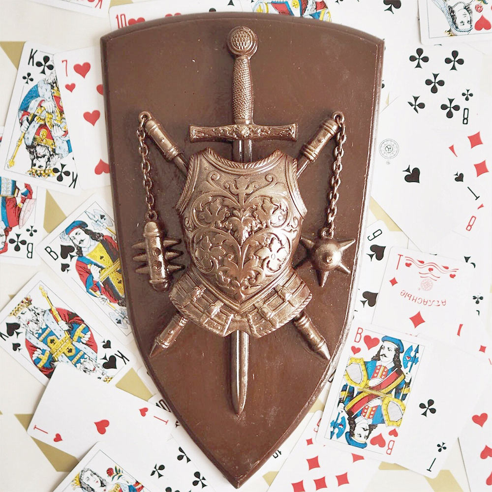 Деликатес «Щит и меч» из молочного шоколада, созданный с потрясающей точностью мастерами-шоколатье компании «Конфаэль», вызывает неподдельный интерес не только у детишек, но и у взрослых.