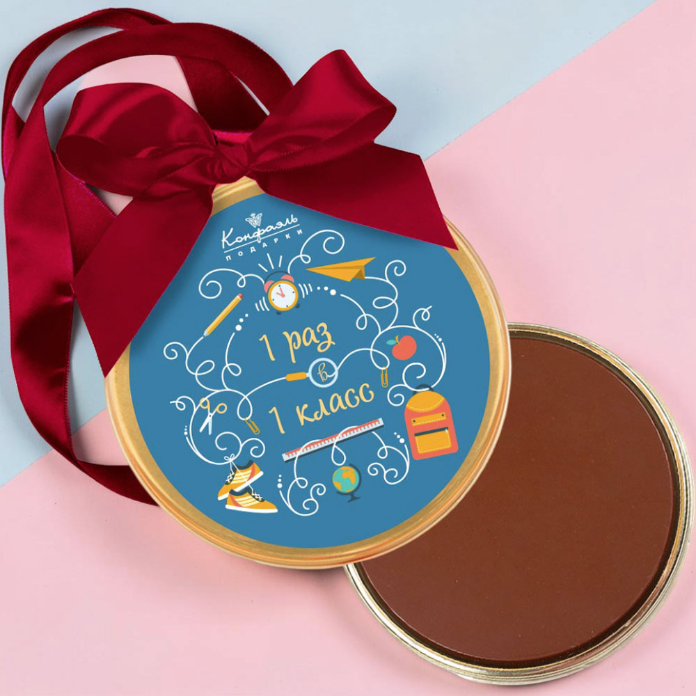 Для этой цели отлично подойдёт медаль «Вперёд к знаниям!», изготовленная из молочного шоколада и привлекающая детское внимание своим жизнерадостным дизайном.