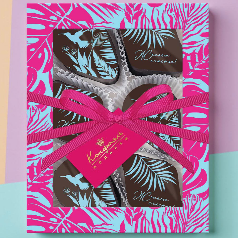 Состав: шоколадная масса – сахар, тертое какао, какао-порошок, масло какао, эмульгаторы (лецитин соевый, Е476); начинки – сахар, патока, масло сладко-сливочное, белок яичный, желирующий агент (агар), экстракт лимона, регулятор кислотности (лимонная кислота), ароматизаторы, пищевые красители (куркумин, свекольный концентрат); декор – пищевые красители (Е132, Е171). Продукция производится на предприятии, где используются арахис, кунжут, орехи, яичные и молочные продукты, злаки, содержащие глютен.
