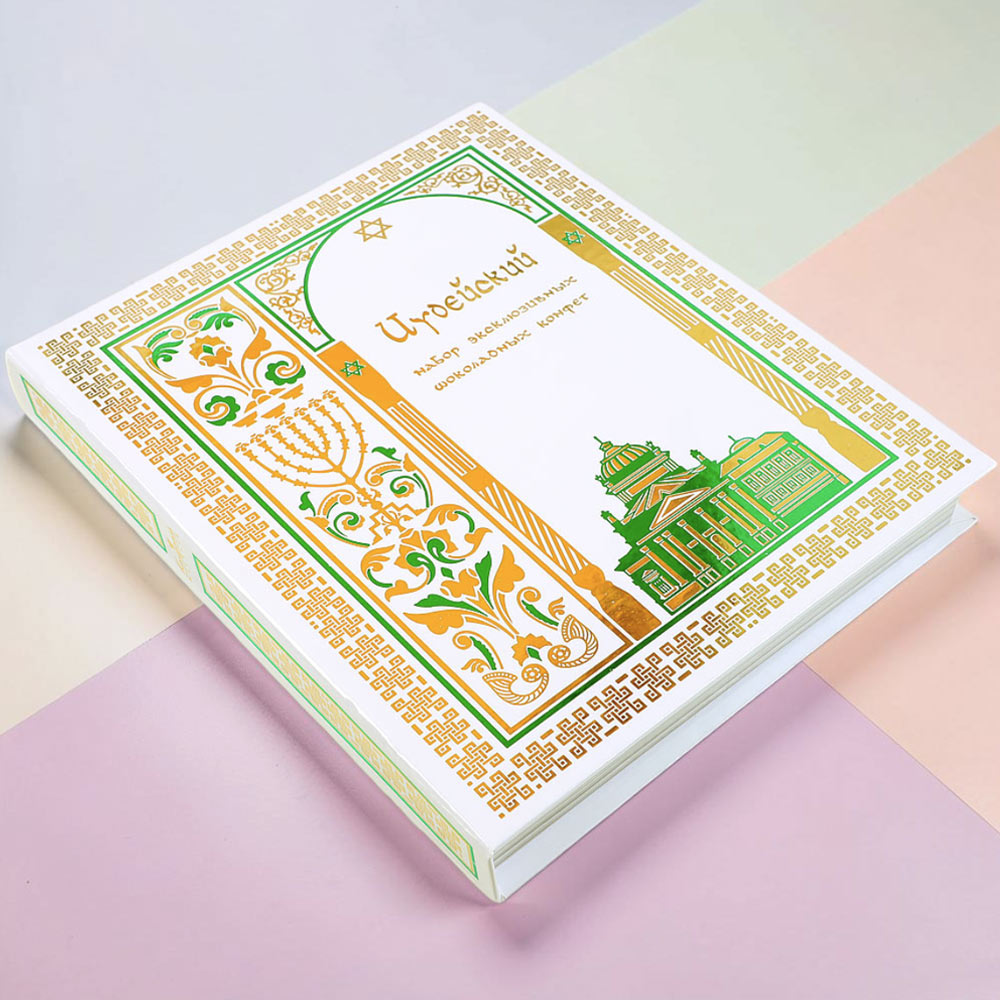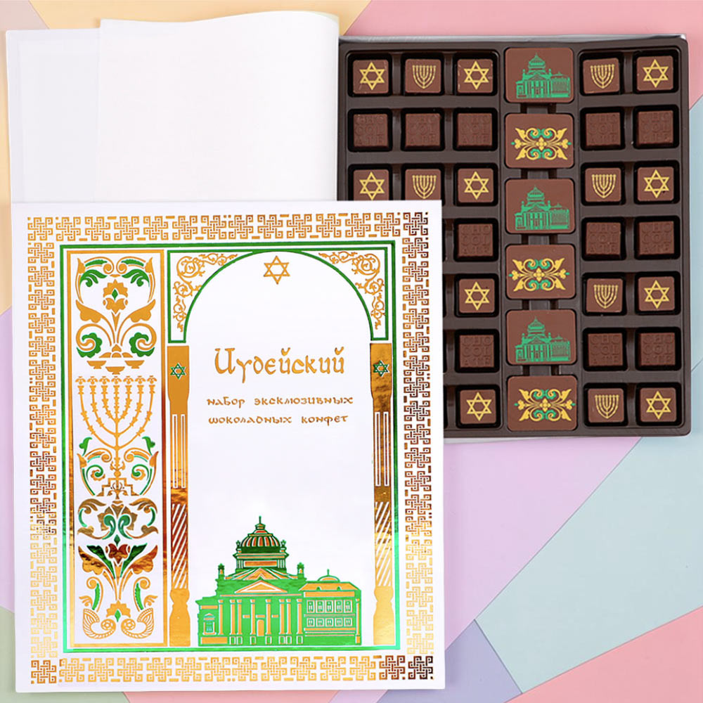 Обложка, также как и конфеты, украшена традиционными символами иудаизма, что подчеркнет Ваше уважение к получателю и искренность, с который Вы выбирали подарок для него.