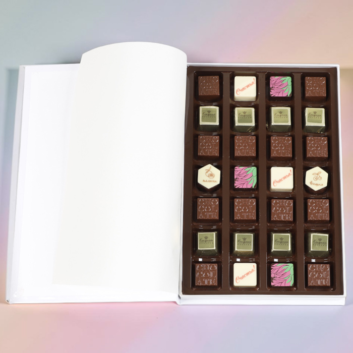 шоколадные массы - какао-масло, какао тертое, сахар, молоко сухое цельное, молоко сухое обезжиренное, лактоза, эмульгатор (лецитин соевый), ароматизатор («Ванилин»); начинки - сахар, патока, какао-масло, какао тертое, молоко сгущенное (молоко цельное, сахар (сахароза, лактоза)), сливки сгущенные с сахаром (сливки нормализованные, сахар (сахароза), лактоза), молоко сухое, рафинированные дезодорированные растительные масла, натуральные концентрированные соки, стабилизатор (мальтодекстрин, гуммиарабик), желирующие агенты (агар, желатин говяжий), коньяк (дистиллят коньячный, вода, сахар, натуральный пищевой краситель («Карамельный колер») спирт этиловый ректификованный, консервант (сорбиновая кислота), регулятор кислотности (лимонная кислота), эмульгаторы (лецитин соевый, Е471), ароматизаторы, натуральный пищевой краситель «Карамельный колер»; декор - пищевые красители (куркумин, Е132, Е171), пищевой краситель (концентрированный сок красной свеклы, масло подсолнечное, эмульгаторы (мальтодекстрин, Е472с), регуляторы кислотности (лимонная кислота, аскорбиновая кислота))