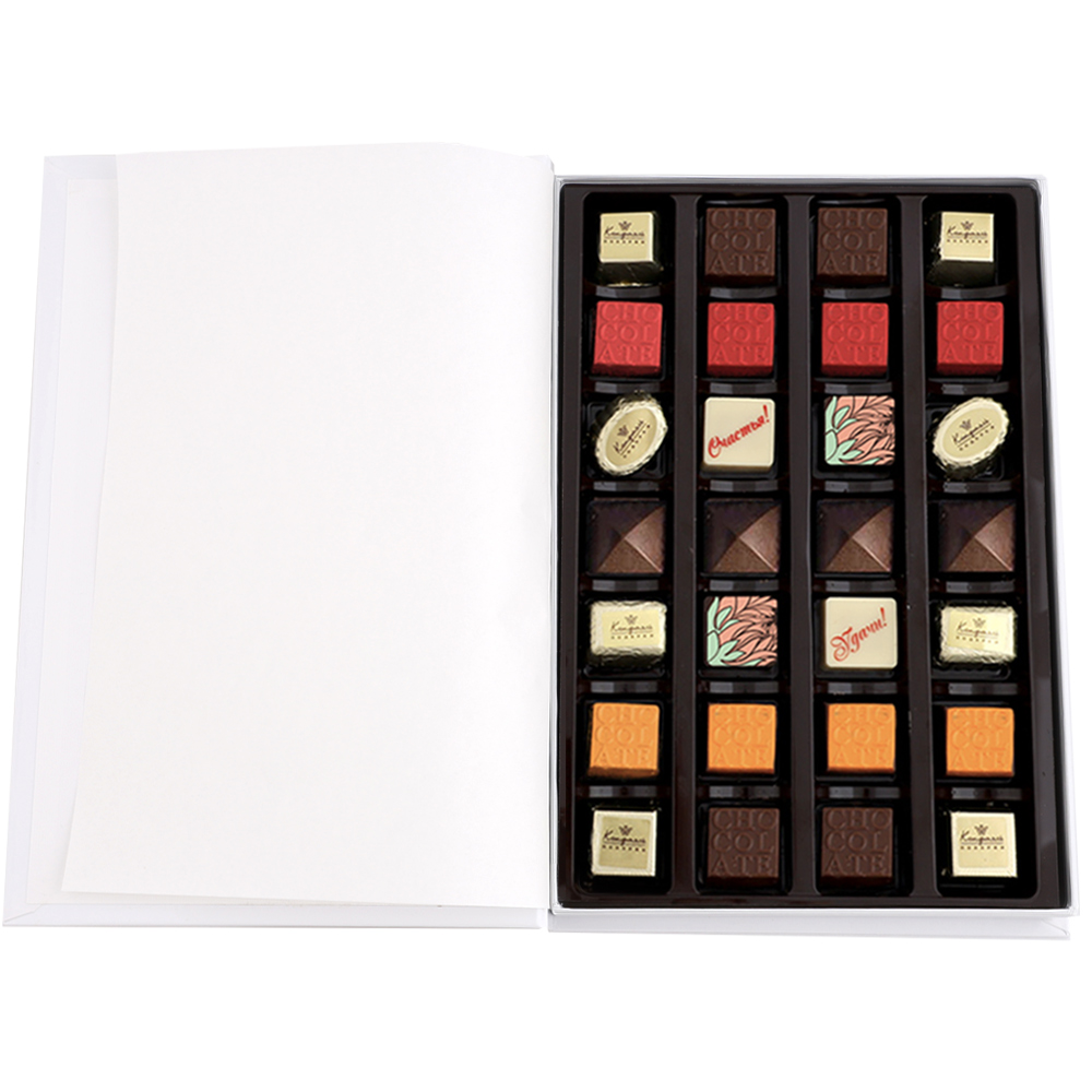 шоколадные массы - какао-масло, какао тертое, сахар, молоко сухое цельное, молоко сухое обезжиренное, лактоза, эмульгатор (лецитин соевый), ароматизатор («Ванилин»); начинки - сахар, патока, какао-масло, какао тертое, молоко сгущенное (молоко цельное, сахар (сахароза, лактоза)), сливки сгущенные с сахаром (сливки нормализованные, сахар (сахароза), лактоза), молоко сухое, рафинированные дезодорированные растительные масла, натуральные концентрированные соки, стабилизатор (мальтодекстрин, гуммиарабик), желирующие агенты (агар, желатин говяжий), коньяк (дистиллят коньячный, вода, сахар, натуральный пищевой краситель «карамельный колер»), спирт этиловый ректификованный, консервант (сорбиновая кислота), регулятор кислотности (лимонная кислота), эмульгаторы (лецитин соевый, Е471), ароматизаторы («Вишня», «Апельсин», «Ваниль», «Черная смородина»,«Клубника», «Карамель», «Кофе», «Кокосовые сливки», «Бейлиз»), натуральный пищевой краситель «Карамельный колер»; декор - пищевые красители (куркумин, Е132, Е171), пищевой краситель (концентрированный сок красной свёклы, масло подсолнечное, эмульгаторы (мальтодекстрин, Е472с), регуляторы кислотности (лимонная кислота, аскорбиновая кислота))