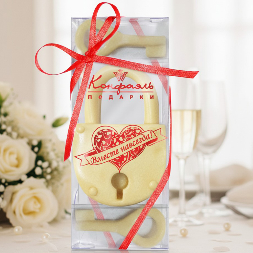 Белый шоколад в виде замка с двумя ключами и символичной надписью «Вместе навсегда», изготовленный из элитных ингредиентов, - это особый символ для вас от шоколатье компании «Конфаэль».