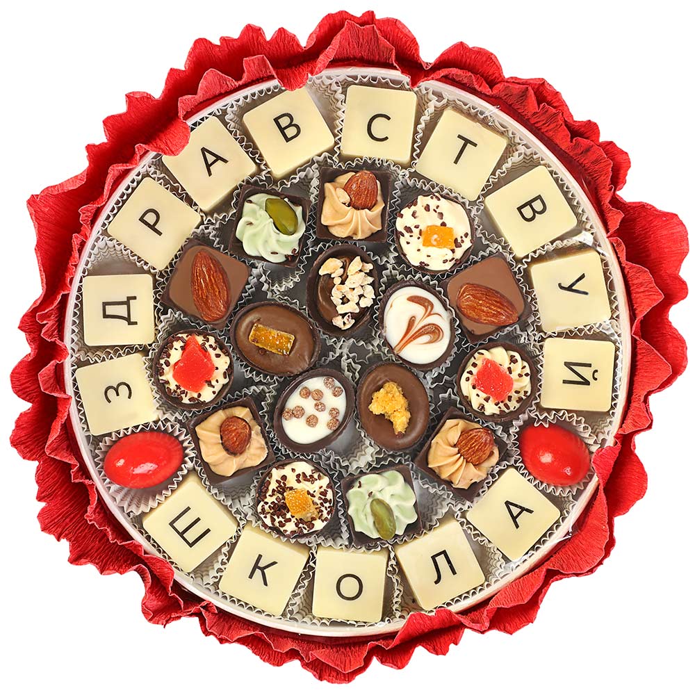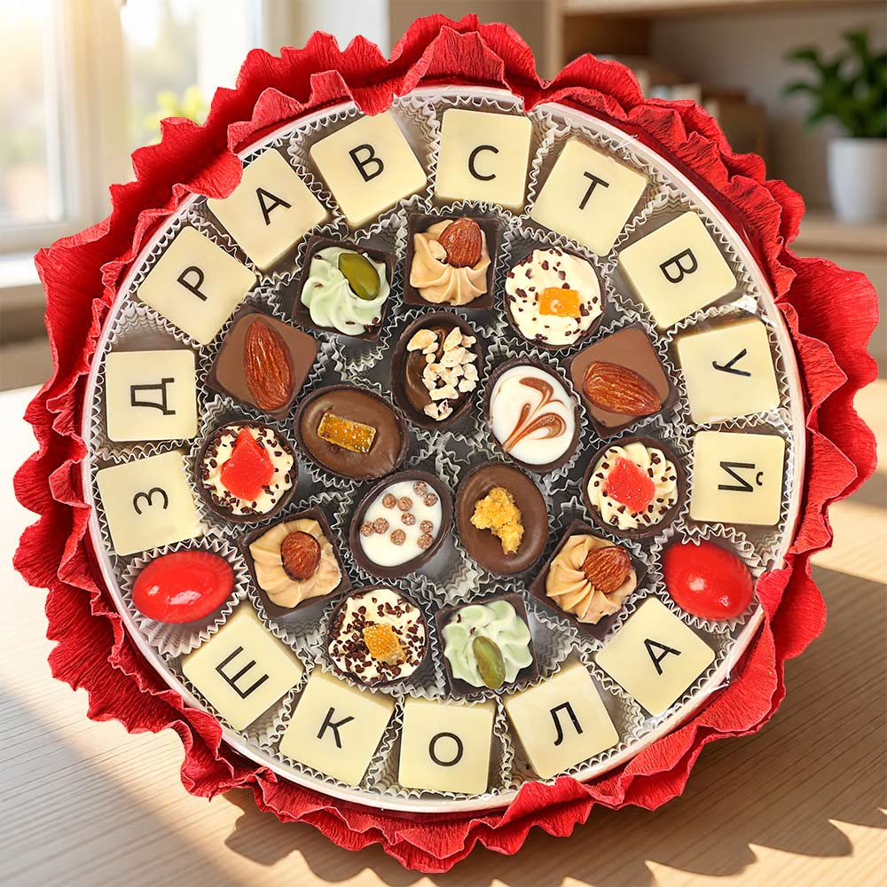 Букет с конфетами и драже «Здравствуй, школа!» - сладкий шедевр, объединивший креатив дизайнерского оформления десерта с высочайшим качеством настоящего шоколада, из которого изготовлены все лакомства.